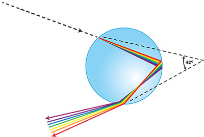 Cahaya memasuki tetesan air, membengkokkan saat melambat dari udara ke air yang lebih padat. Cahaya memantul di bagian dalam tetesan air, terpisah menjadi beberapa komponen panjang gelombang-atau warna. Ketika keluar dari tetesan air, cahaya tersebut membentuk pelangi.
